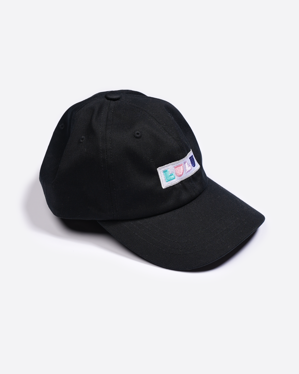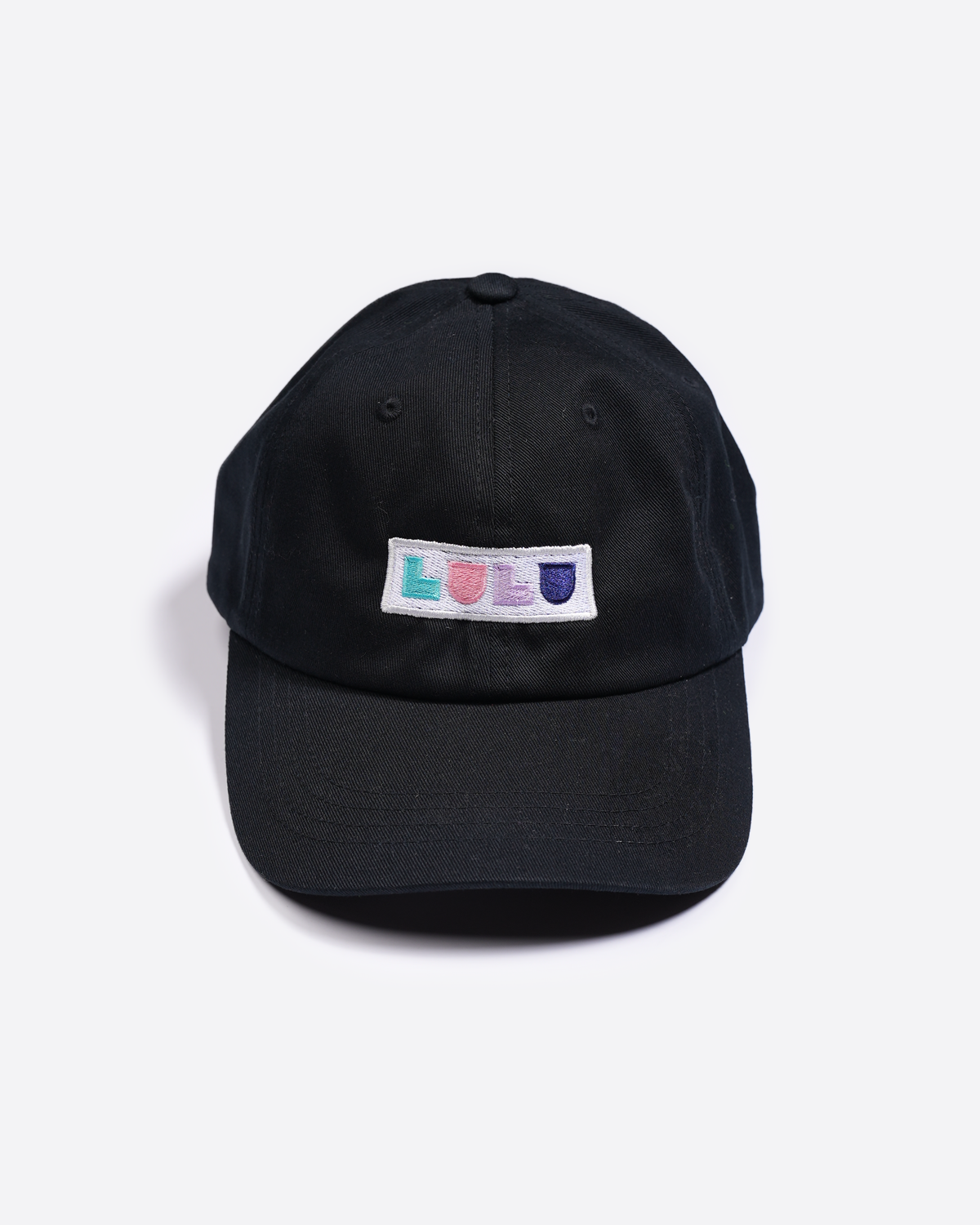 LuluLuvely Dad Hat features a cotton body, black visor, black under bill, and an adjustable closure. The cap is detailed with signature LuluLuvely logo embroidered across the front panel.