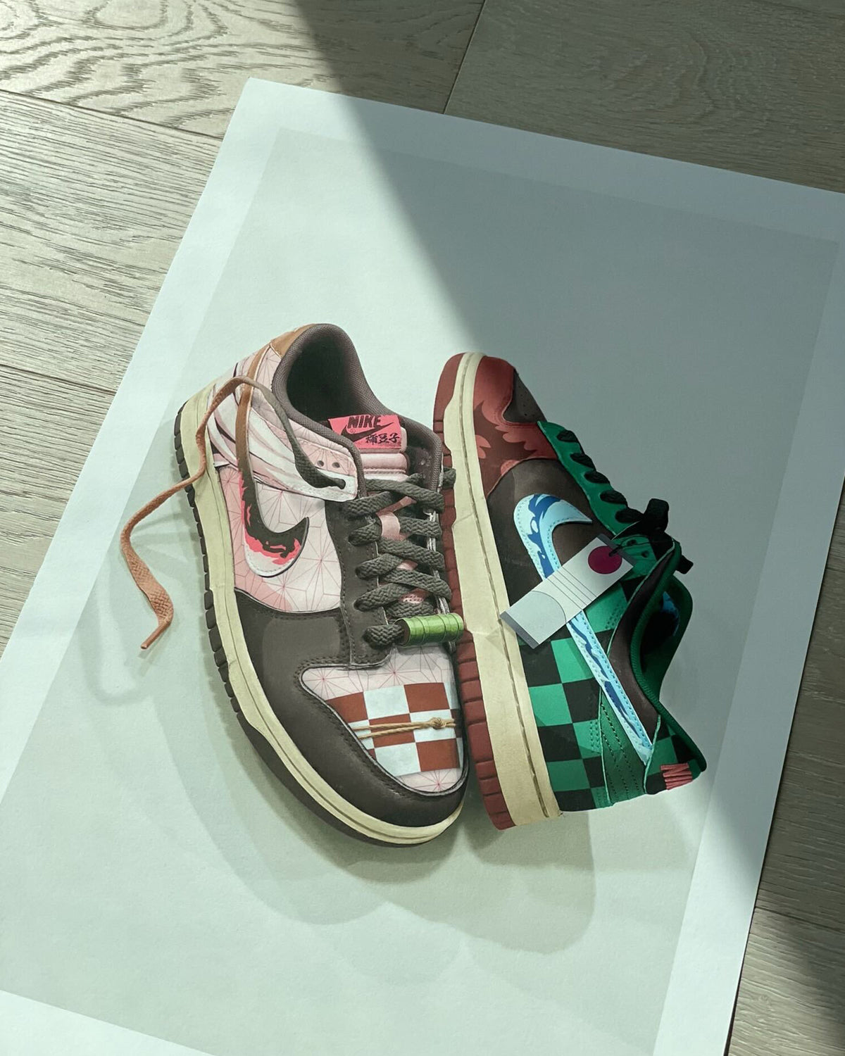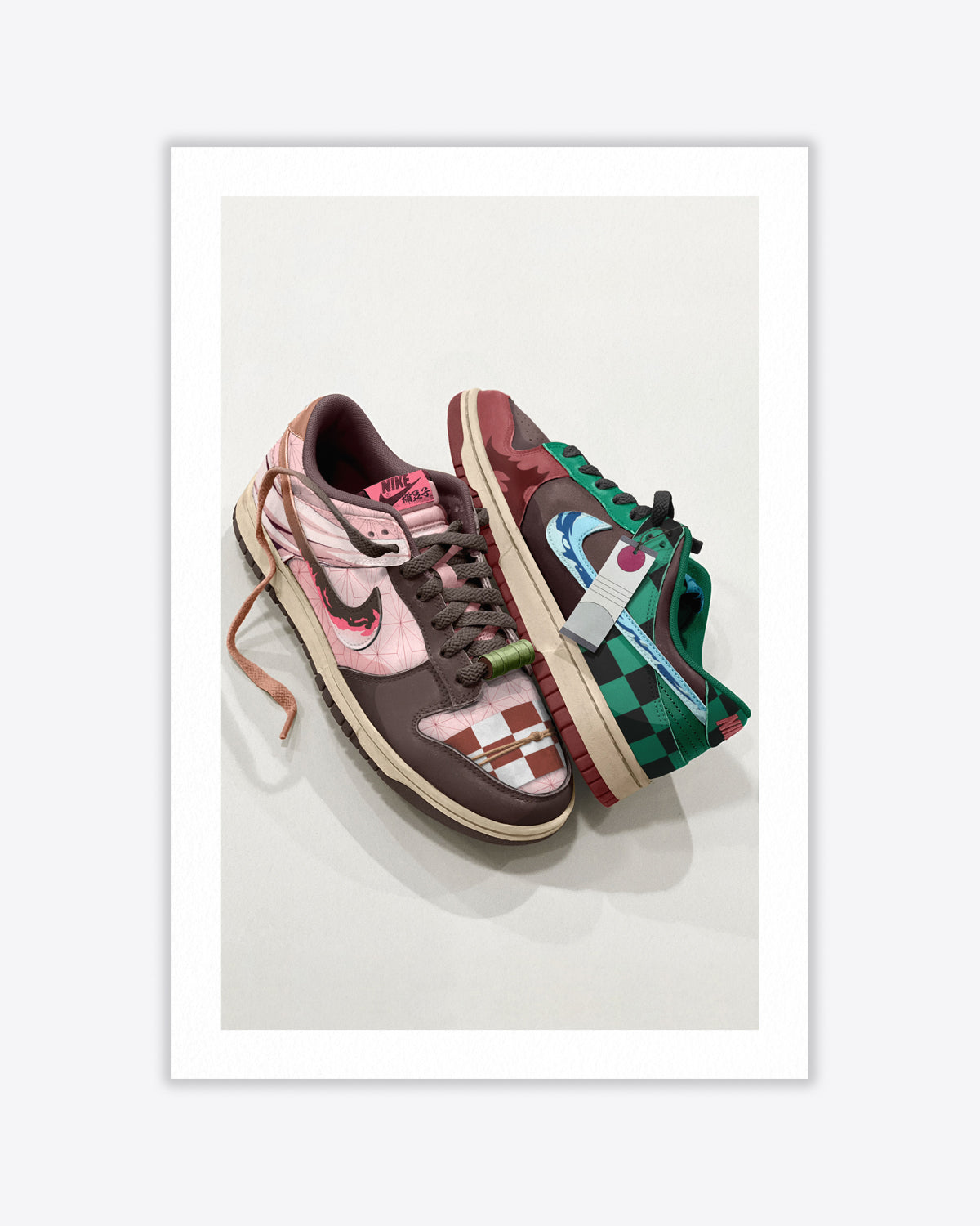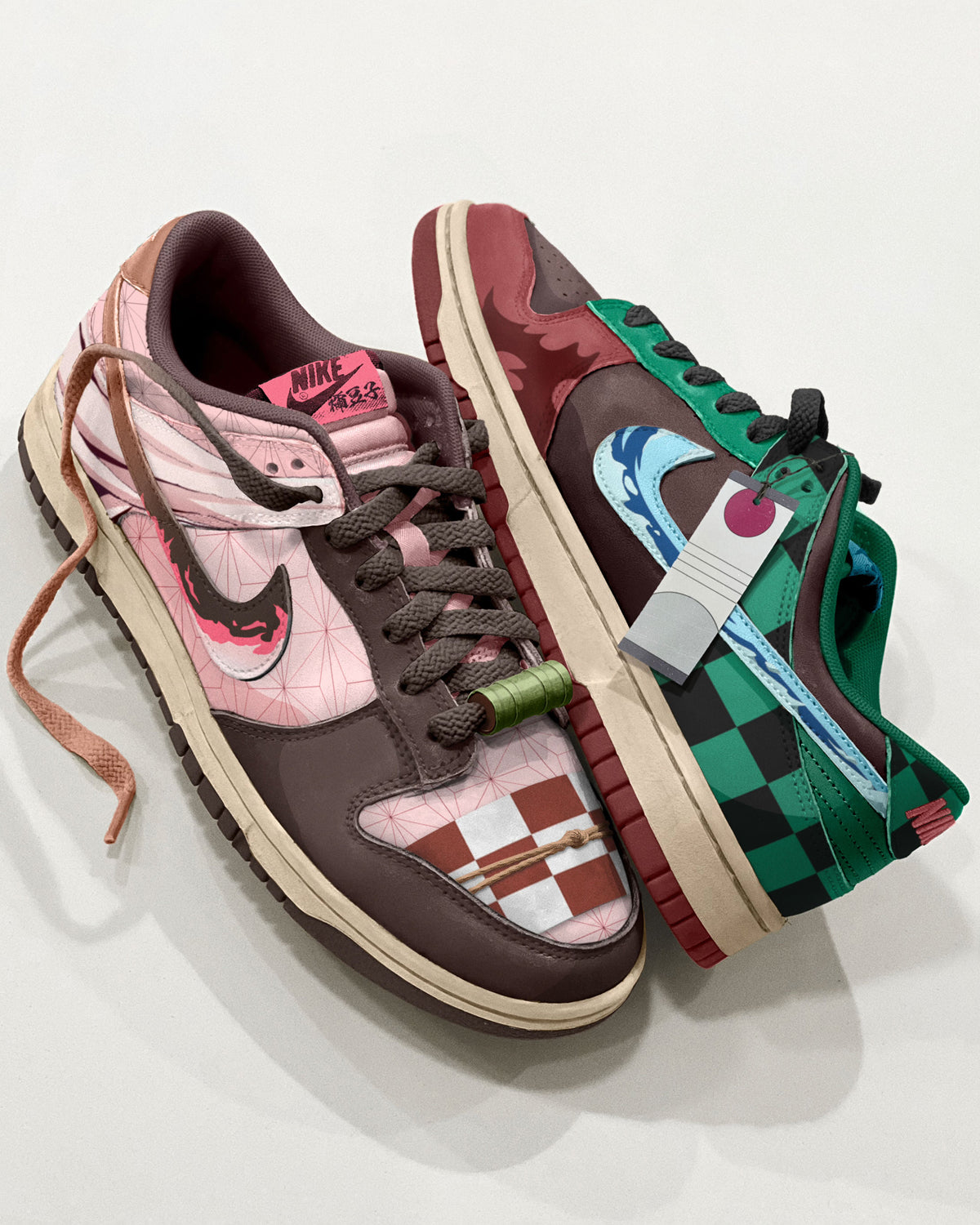 Custom Dunk Low concept inspired by the hit anime series Demon Slayer, featuring references to Nezuko (right pair), and Tanjiro (left pair).