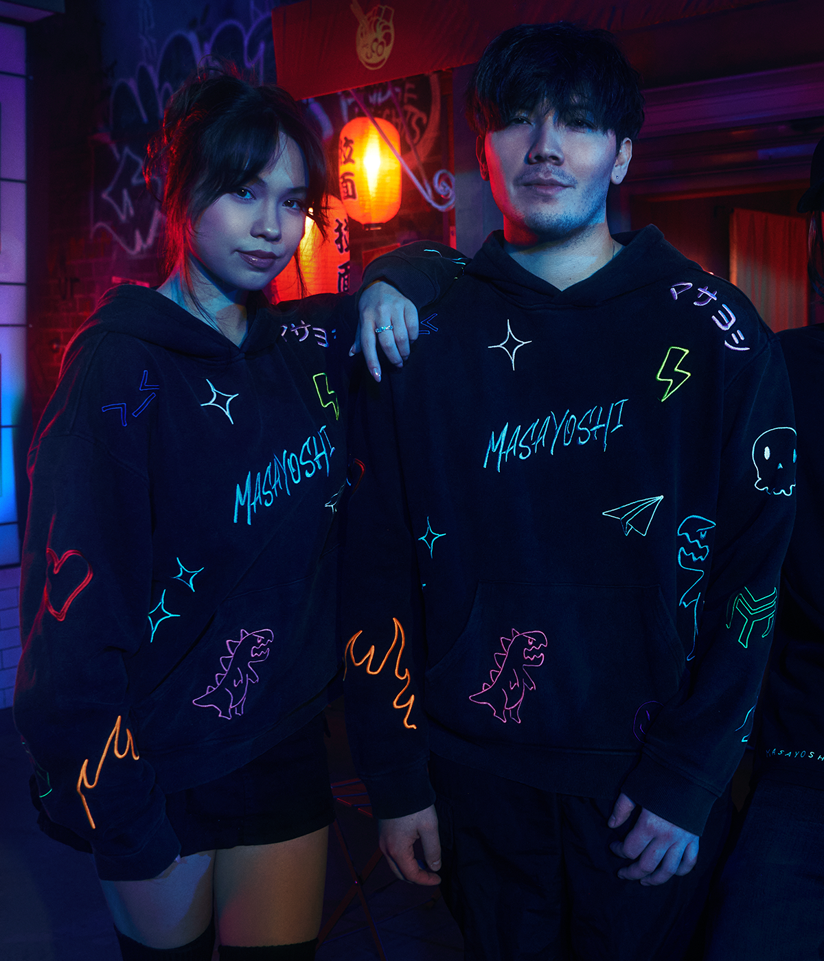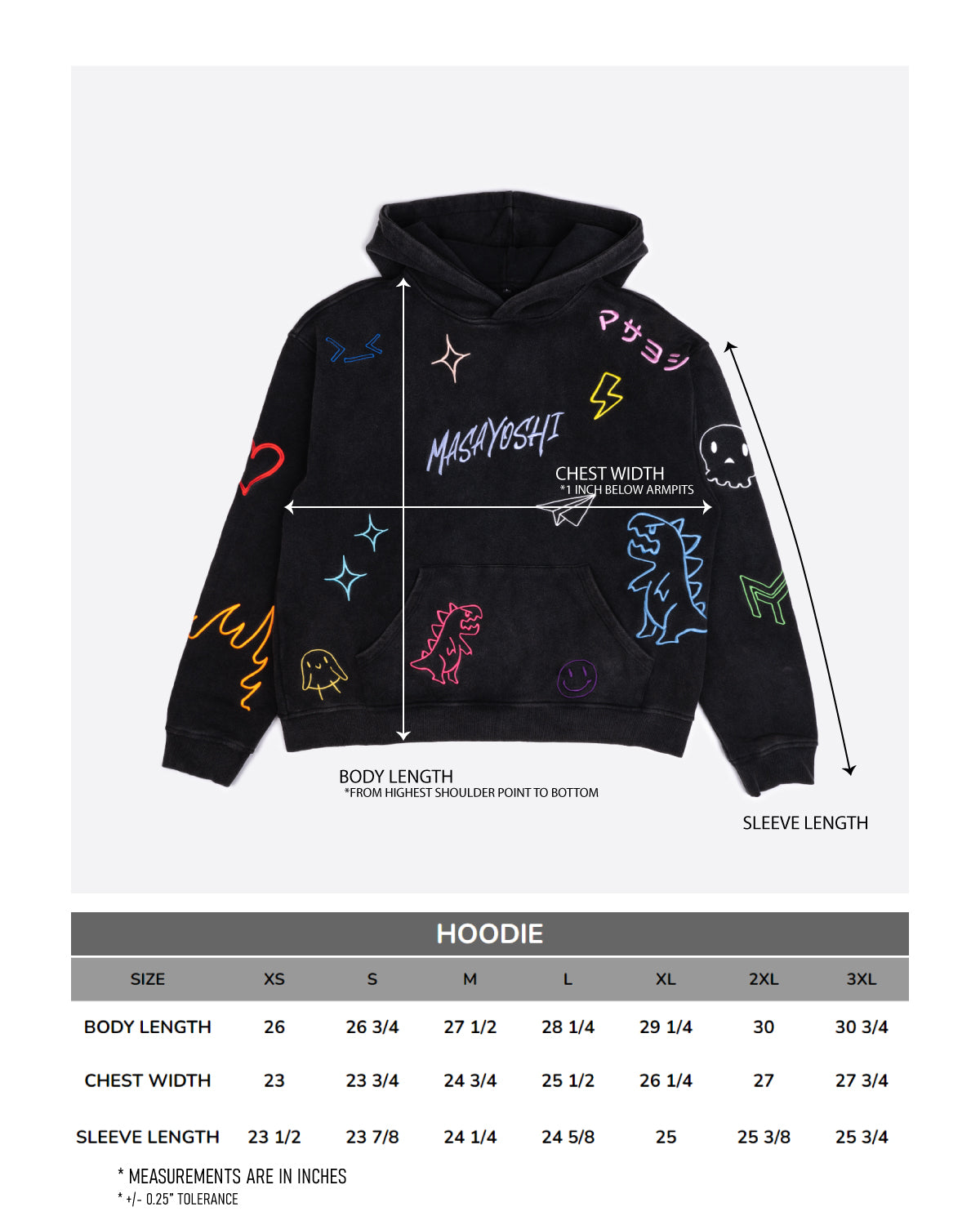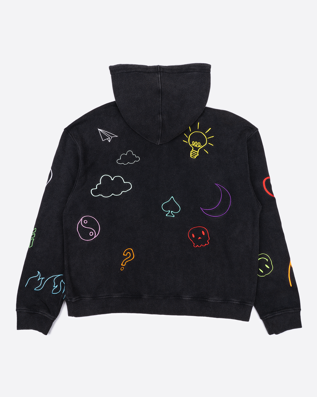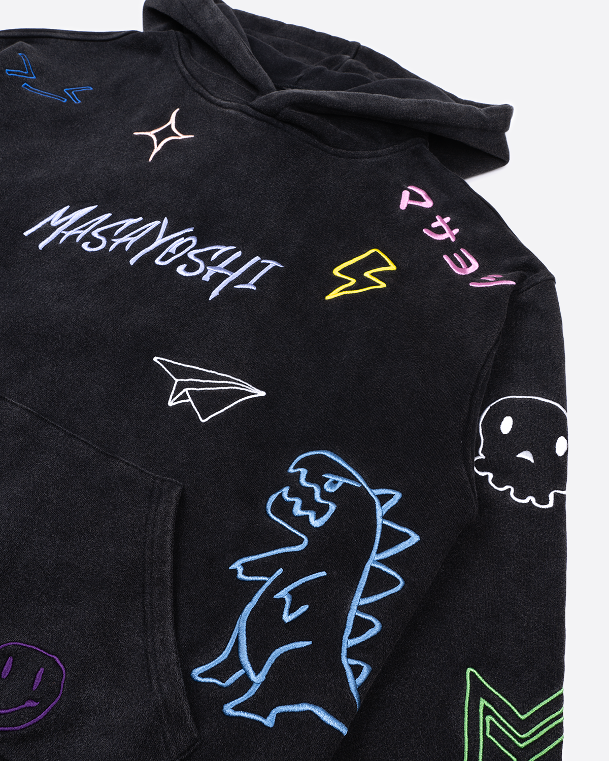 Back by popular demand! Masayoshi's Doodlez Pullover from the Dark Mode Collection. Featuring over 25 unique embroidery doodlez on a custom silhouette!