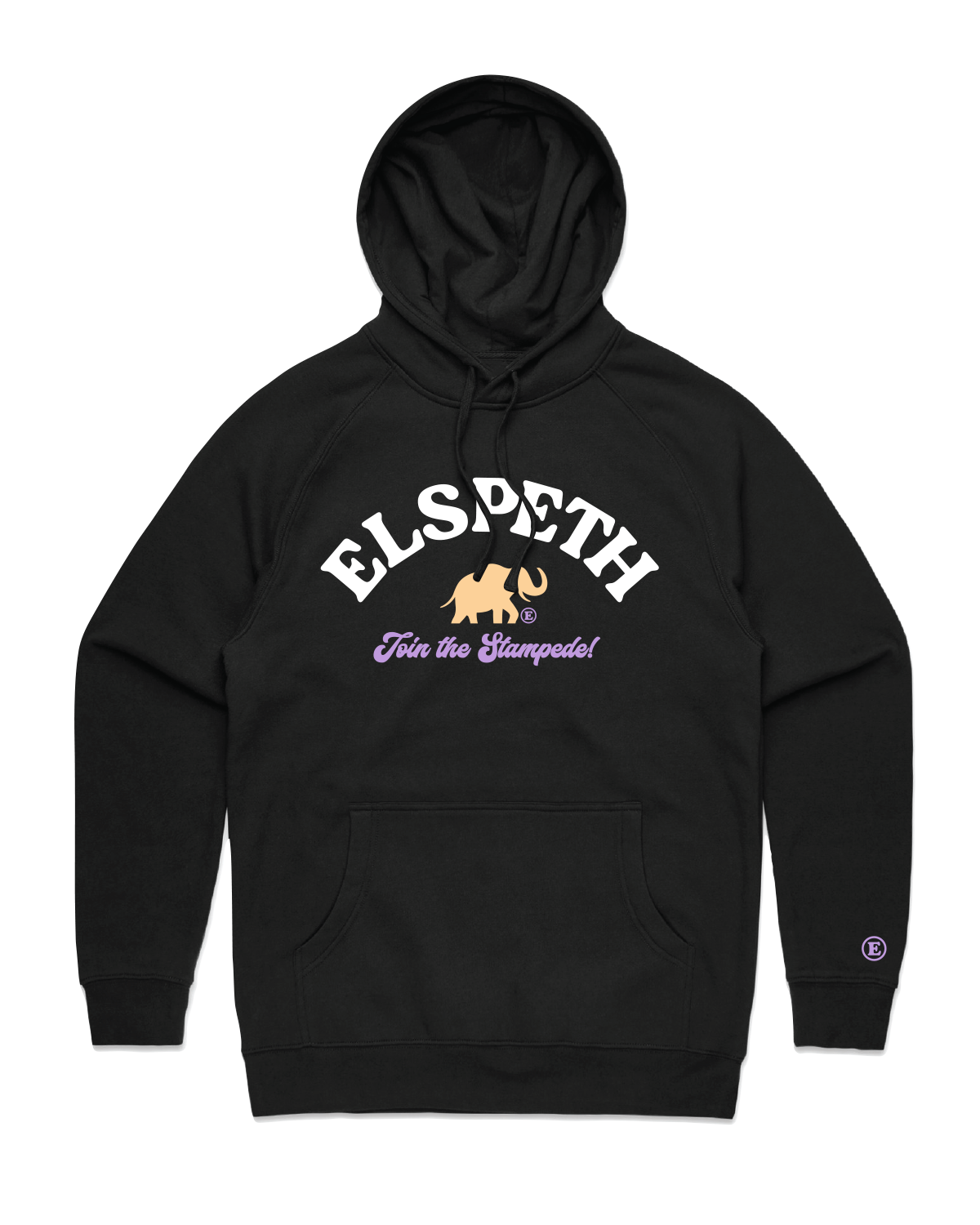 The Elspeth Black Hoodie is a premium pullover hoodie, featuring screen print detailing on the chest and sleeve