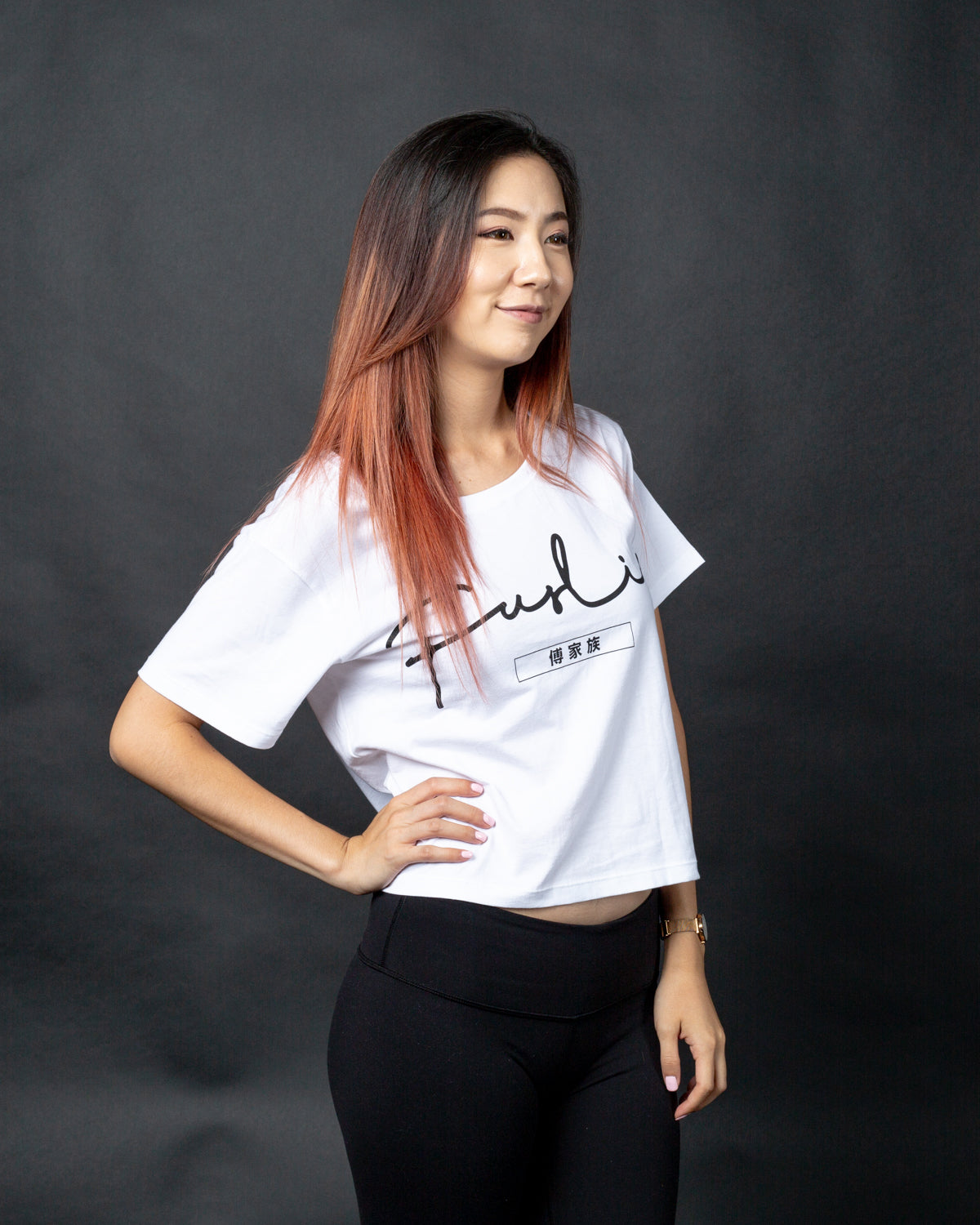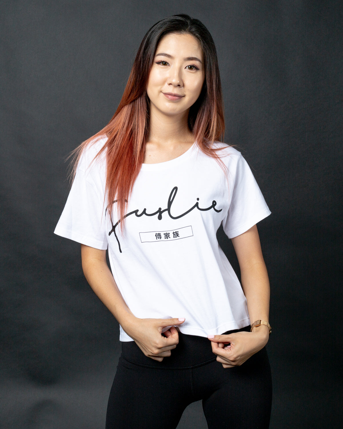 The Fuslie White Crop Tops "Signature" Collection is comprised of 100% combed cotton. The tee body features a light weight cotton, pre-shrunk and finished with silk screen detailing.