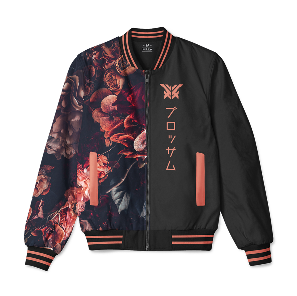 Introducing the DOTEXE n00blet Blossom Bomber Jacket. The n00blet Bomber Jacket features a comfortable, slim-fit, Polyester jacket body with custom sublimated graphics throughout the jacket.. The n00blet bomber is lightweight, windproof, And water resistant.